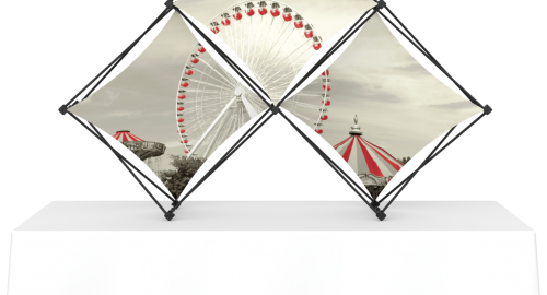 – 8ft wide, pyramid-shaped tabletop fabric popup display system